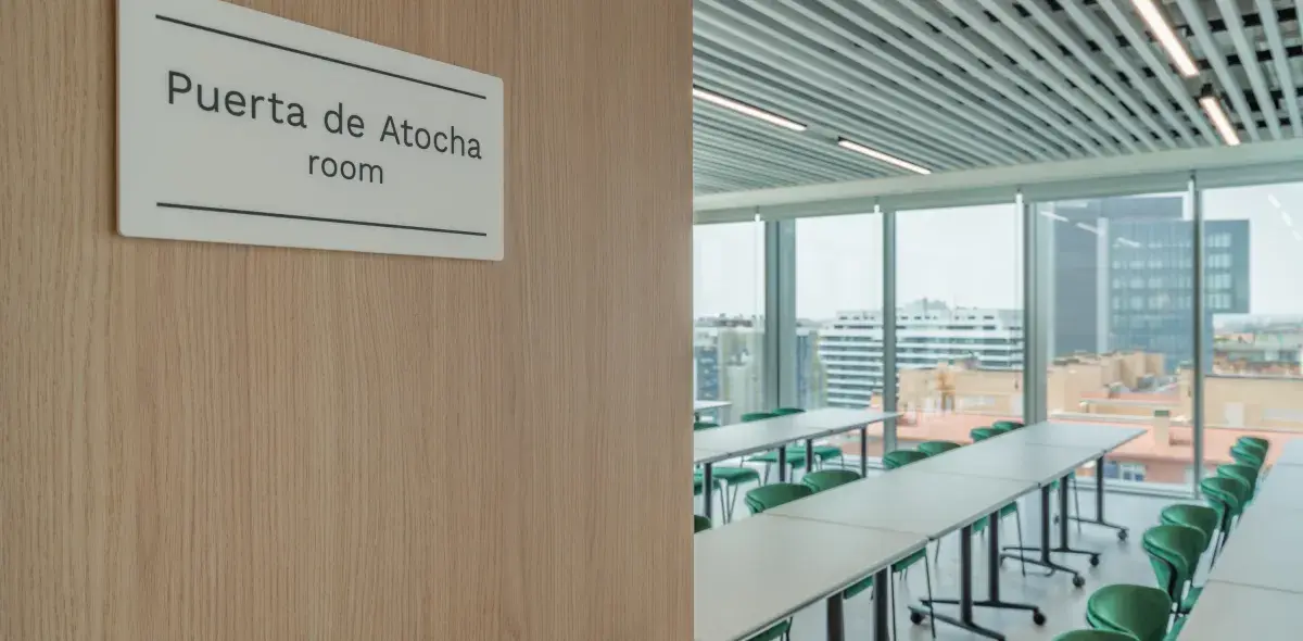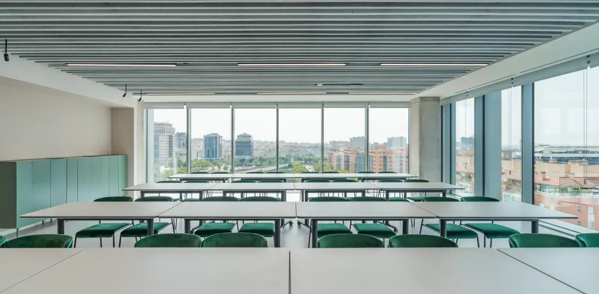 Equipada con pantalla, pizarras, sistema de videoconferencia y mobiliario adaptable.